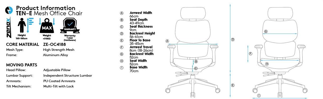 Ten-e Series' Height & Angle -Adjustable Headrest gives users the optimal head & neck support regardless of their height.